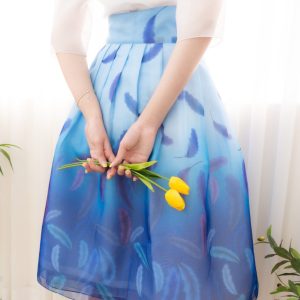 This sophisticated midi skirt features a sheer mesh overlay adorned with a delicate gradient heart print that becomes denser toward the hem, creating a visually striking effect. The high-waist design flatters the figure, while the airy, layered construction adds graceful movement. Perfectly balancing elegance and modern charm, this skirt is ideal for both refined everyday wear and special occasions.