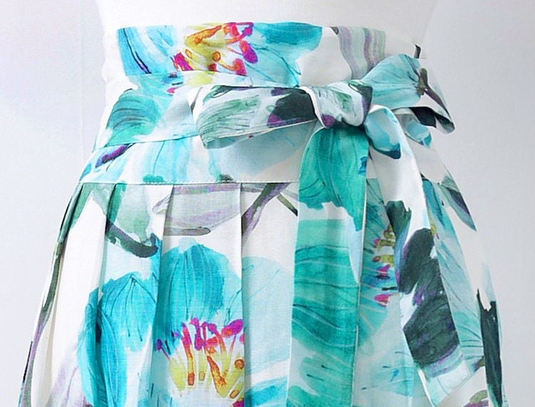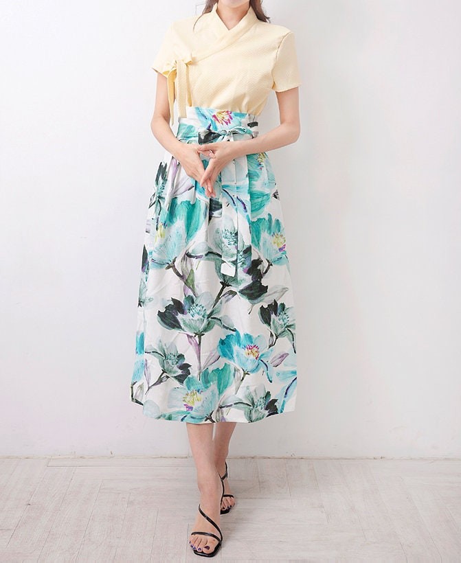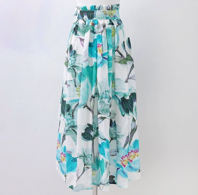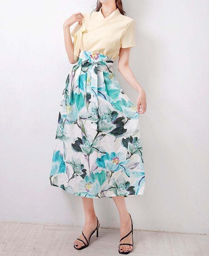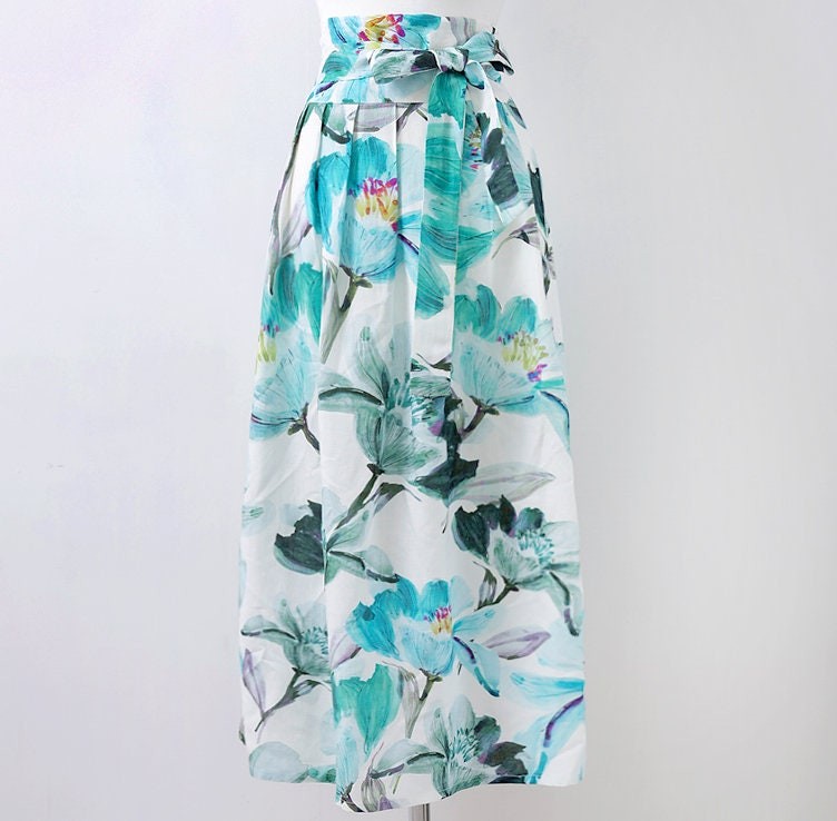 This elegant midi skirt features a refreshing botanical floral print in soft green and blue tones, bringing a natural and airy feel to your look. Designed with a flattering high-waist silhouette and a matching tie belt, it enhances the waistline while offering an adjustable fit. The lightweight fabric and flowing shape create graceful movement, making it perfect for both casual days and refined outings.
