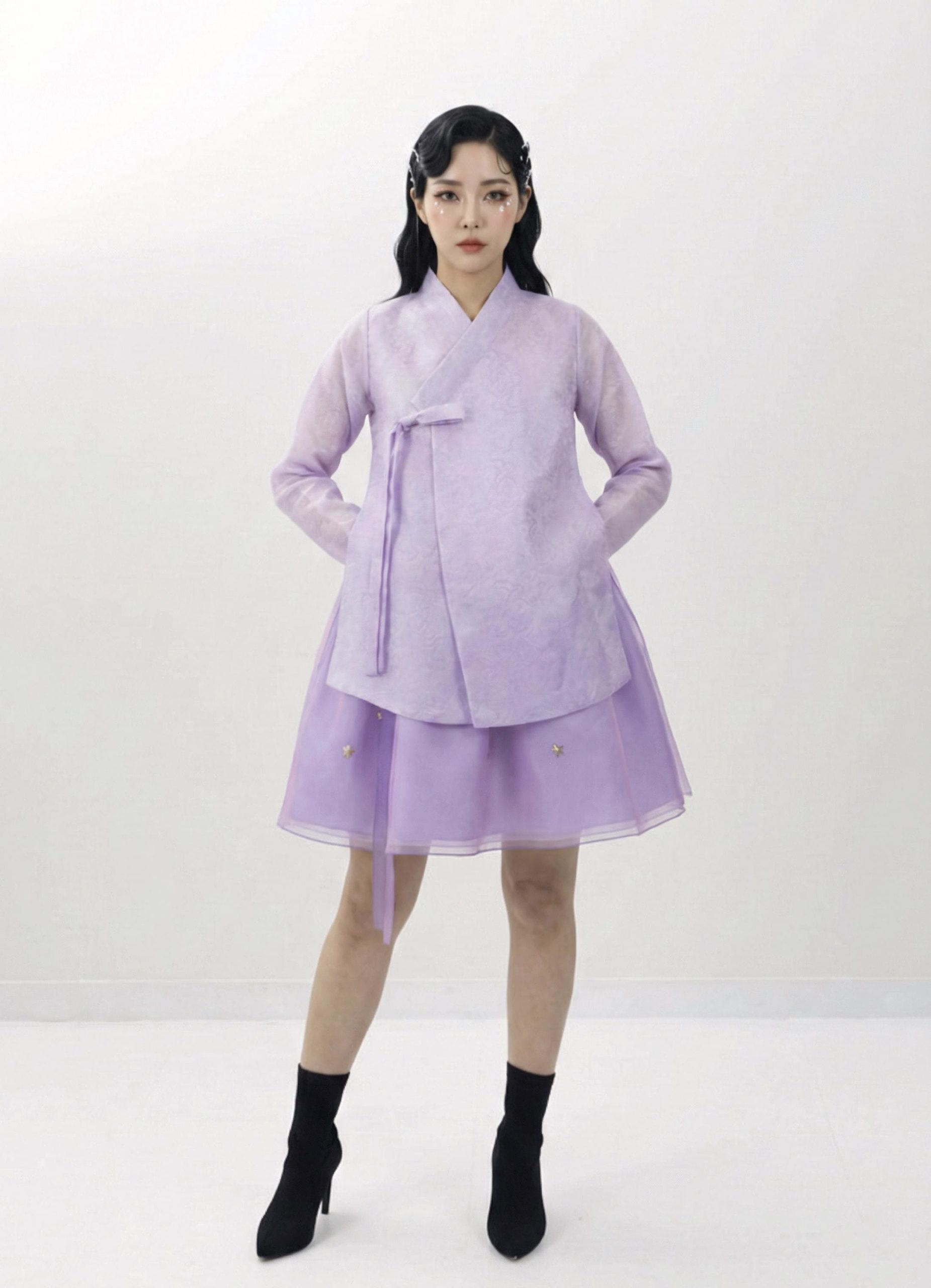 This playful A-line mini skirt features a dreamy sheer overlay in a soft purple hue, creating a light and airy silhouette. Delicate embroidered star accents are scattered across the fabric, adding a subtle whimsical charm. Designed with a high-waist fit and adjustable side tie, this skirt flatters the figure while offering comfort and versatility for casual or statement styling.