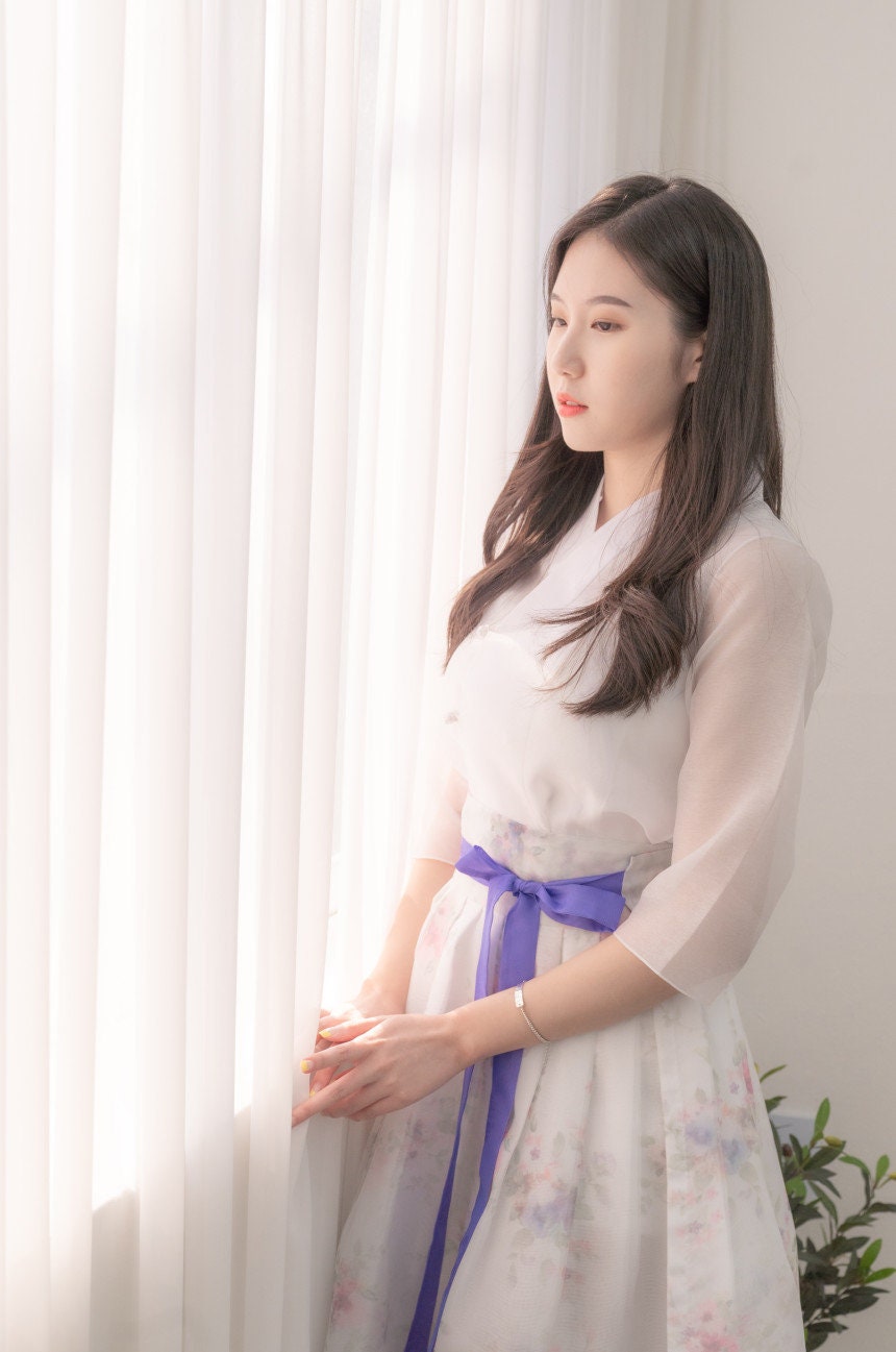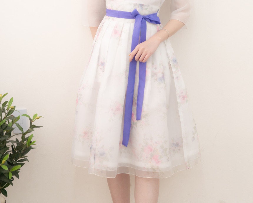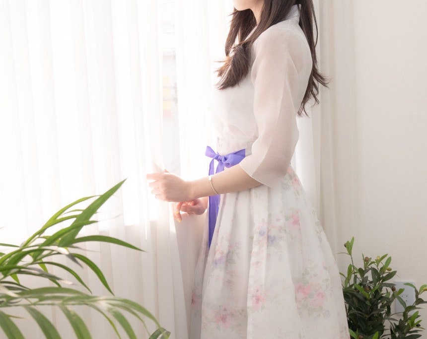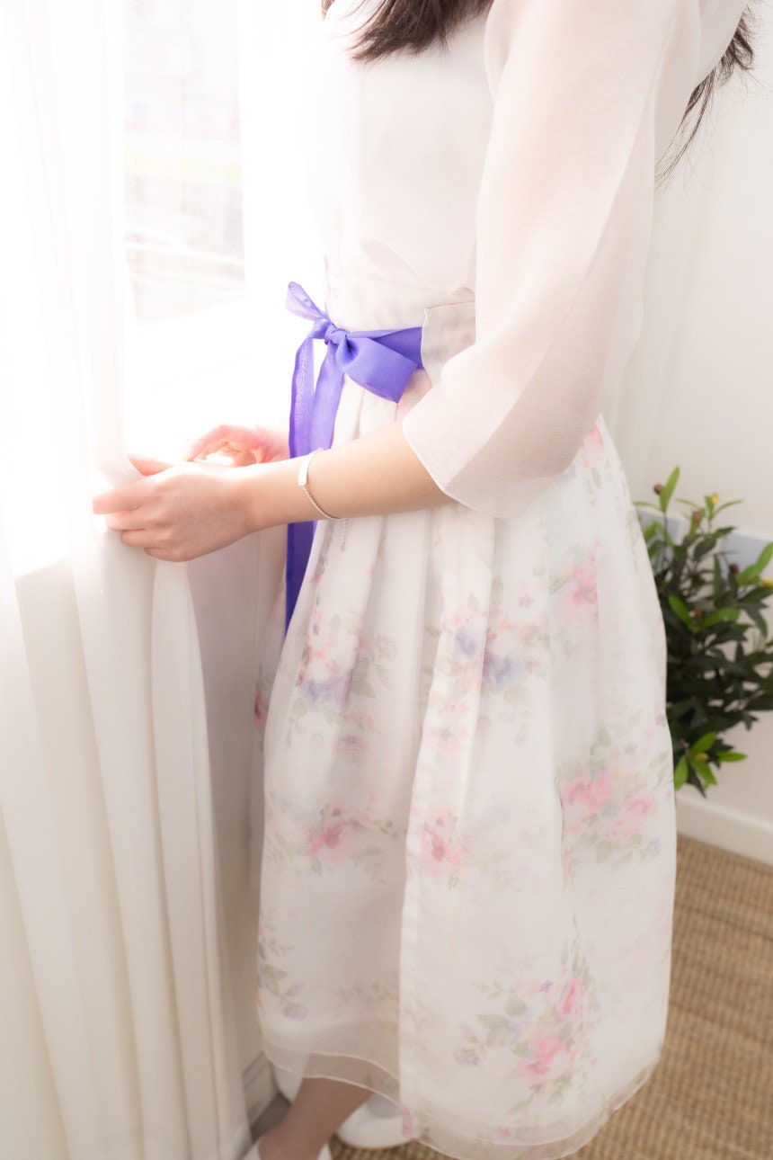 Color: Soft ivory with pastel floral embroidery and purple ribbon